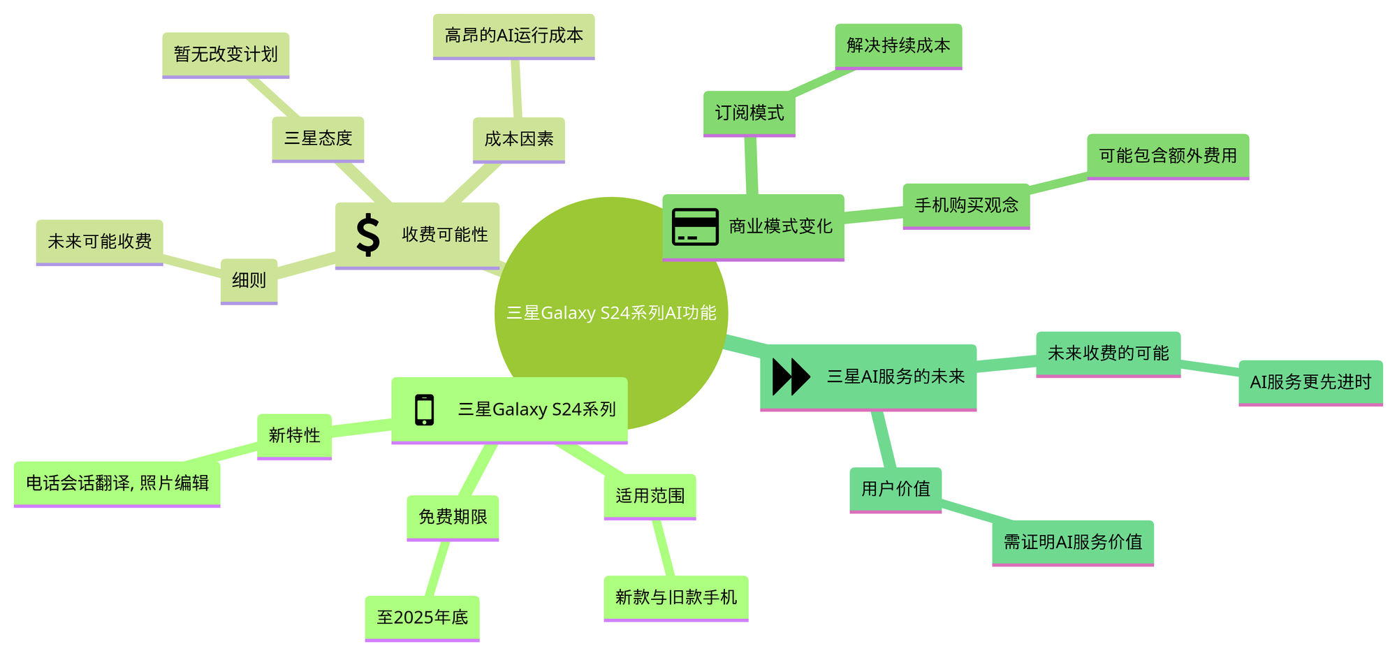 2024年1月19日,三星在Galaxy S24系列中引入了一系列新的AI功能,如实时翻译和照片编辑,但这些功能可能不会永久免费。据三星网站上的细则显示,至2025年底前,这些AI功能将对支持的三星Galaxy设备免费提供,但之后可能需要收费。这种付费模式可能是为了弥补维持这些大型AI模型的昂贵成本。在设备和服务的商业模式中,这可能是一个转变,未来用户可能需要为高级AI功能支付额外的月费,这或许将成为智能手机产业的新趋势。