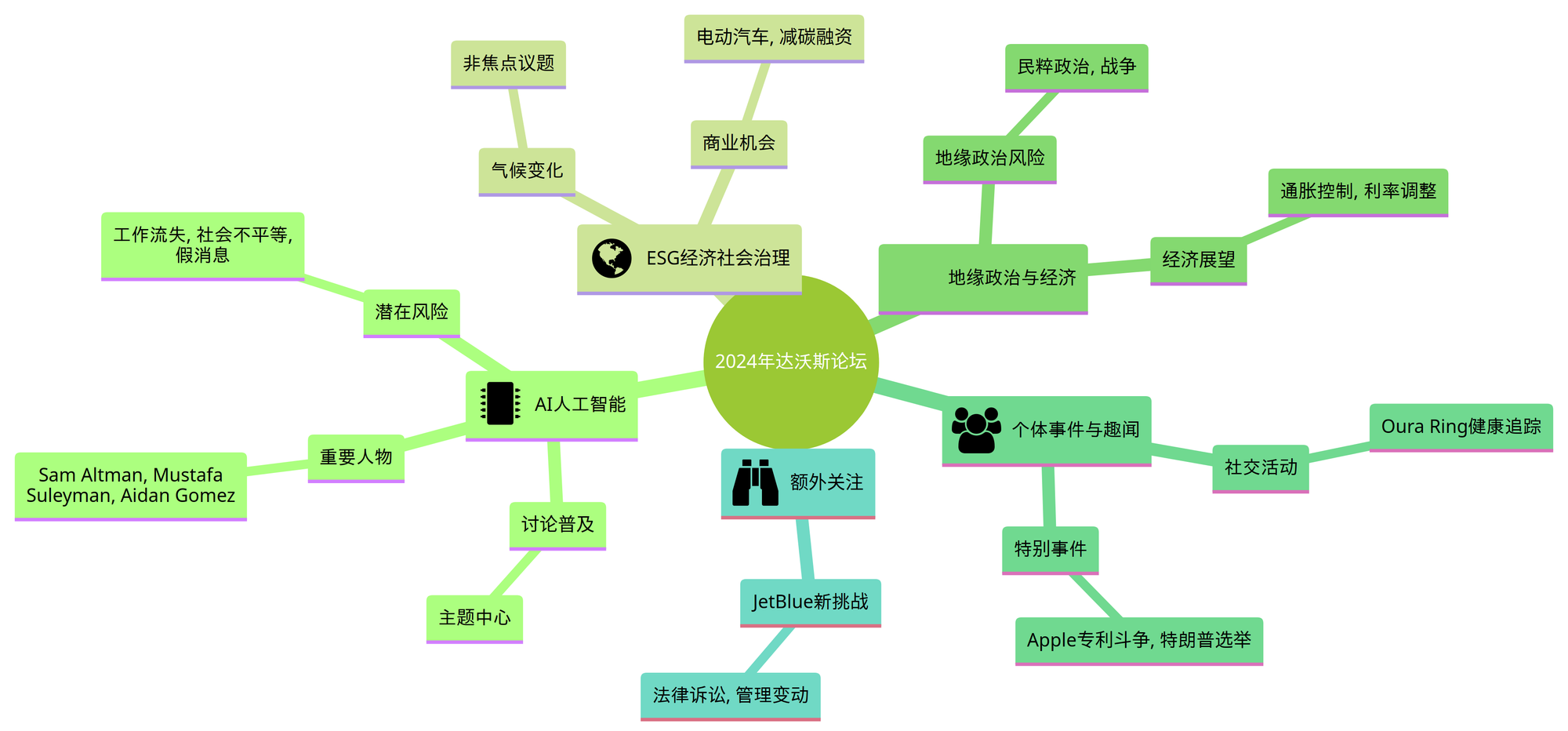 2024年1月20日,瑞士达沃斯,全球领导者年度聚会的非官方主题成为人工智能。这是自2020年以来首次无COVID相关限制的论坛。与会者讨论了人工智能对世界的重塑潜力,同时也关注了AI带来的风险,如就业损失和社会不平等加剧。此外,气候变化和宏观经济前景也是重点议题。与会者普遍对经济持谨慎乐观态度,预测利率下降和通胀控制。会议也见证了重大决策和行业领袖的集中讨论,尤其关注AI技术的未来发展与挑战。