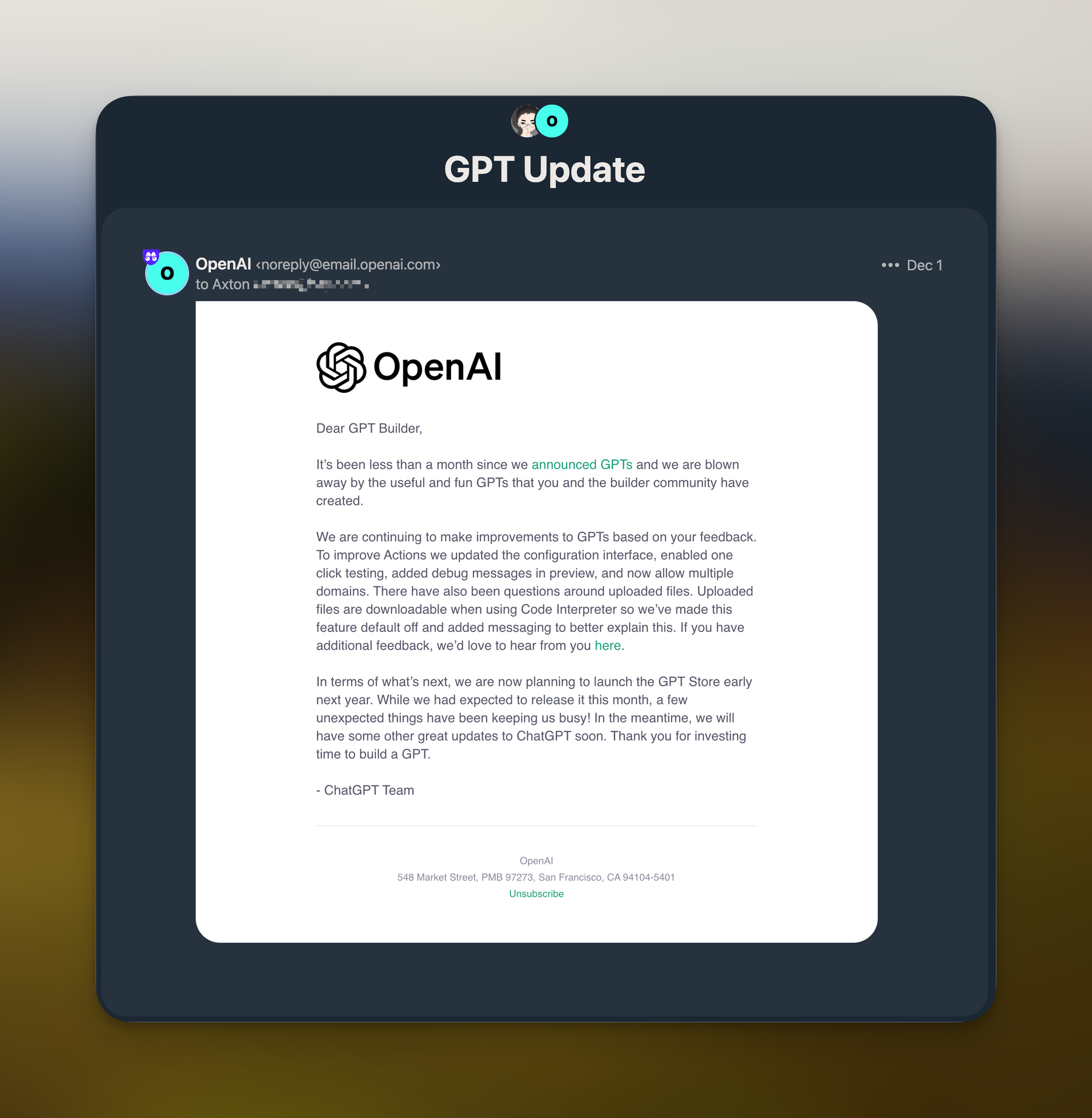 12 月 1 日,收到了 OpenAI 的电子邮件,表示:“关于下一步计划,我们现在计划明年初推出GPT商店。虽然我们原本预期本月发布,但一些事情让我们出乎意料地忙碌!”电子邮件还提到,公司根据用户的反馈对GPT进行了改进,并表示即将对ChatGPT 进行一些重大的更新。