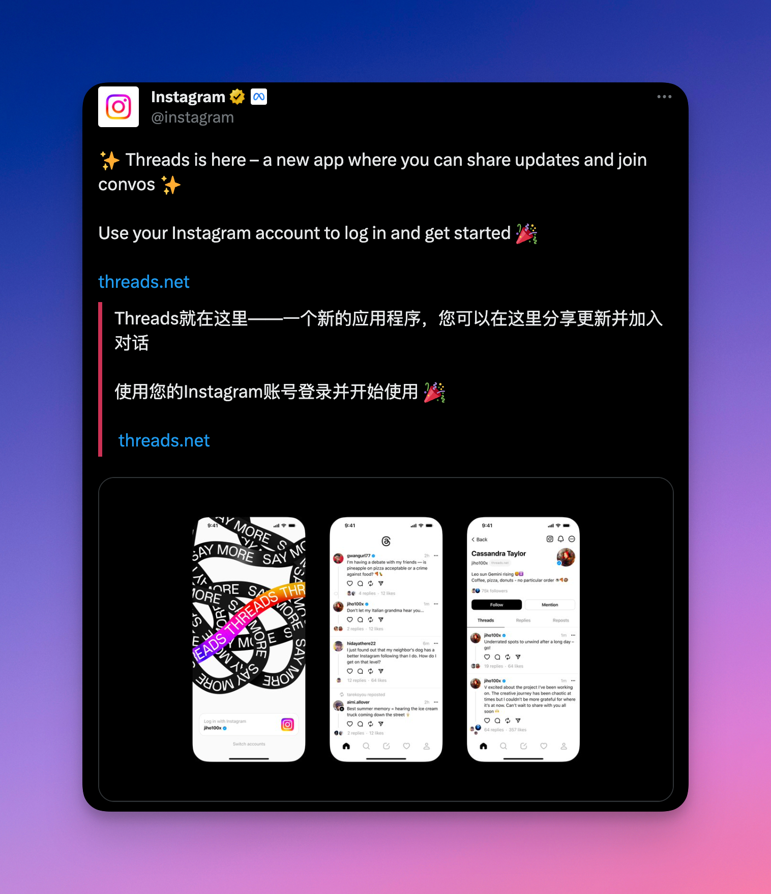 那个挑起埃隆·马斯克与马克·扎克伯格进行肉搏战的APP,Twitter的直接竞争对手,Meta 的 Threads 开放注册了。7小时注册用户破千万,要不要去试一试?顺便关注我一波。