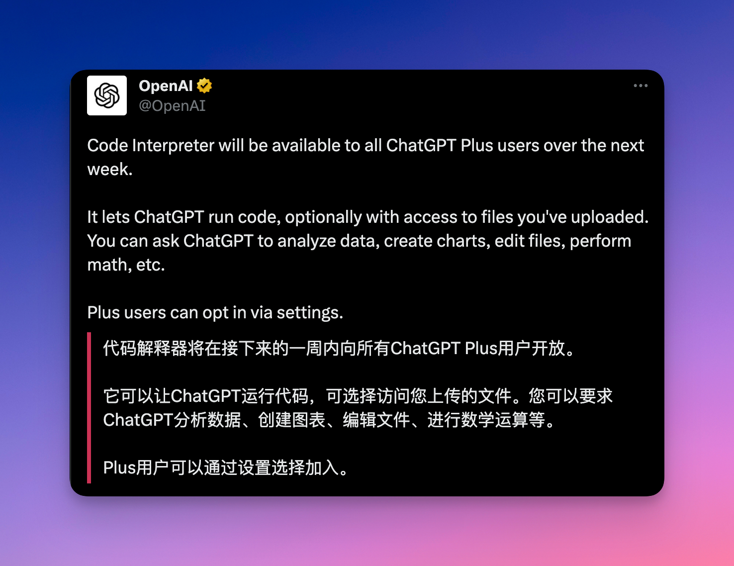 OpenAI 官推宣布,Code Interpreter 代码解释器将在接下来的一周内向所有的ChatGPT Plus 用户开放。做为 ChatGPT 最重量级功能(没错,它将 WebBrowser 还厉害),我对他能如何改变我们的工作充满了期待。看来我要重拾我丢了很久的数据科学技能了 😁