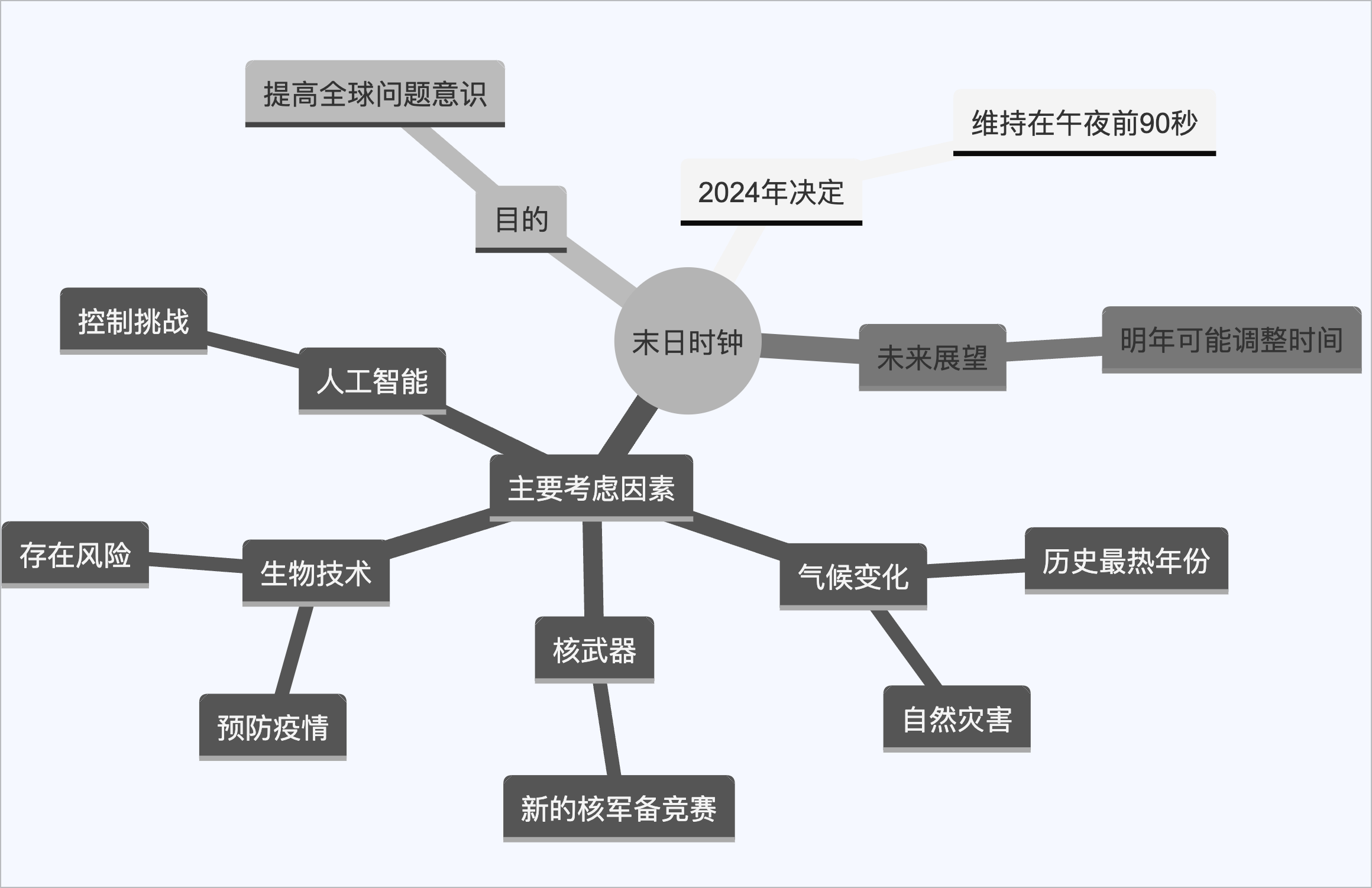 《The Verge》2024年1月23日的报道中提到,尽管世界上出现了加沙地区的战争、历史上最热的一年以及人工智能技术的快速发展,但“末日时钟”在今年保持在午夜前90秒的位置不变。这个时钟由原子科学家公报的专家根据全球性的威胁,如气候变化、核武器和新兴的破坏性技术(包括人工智能和生物技术)来设定。