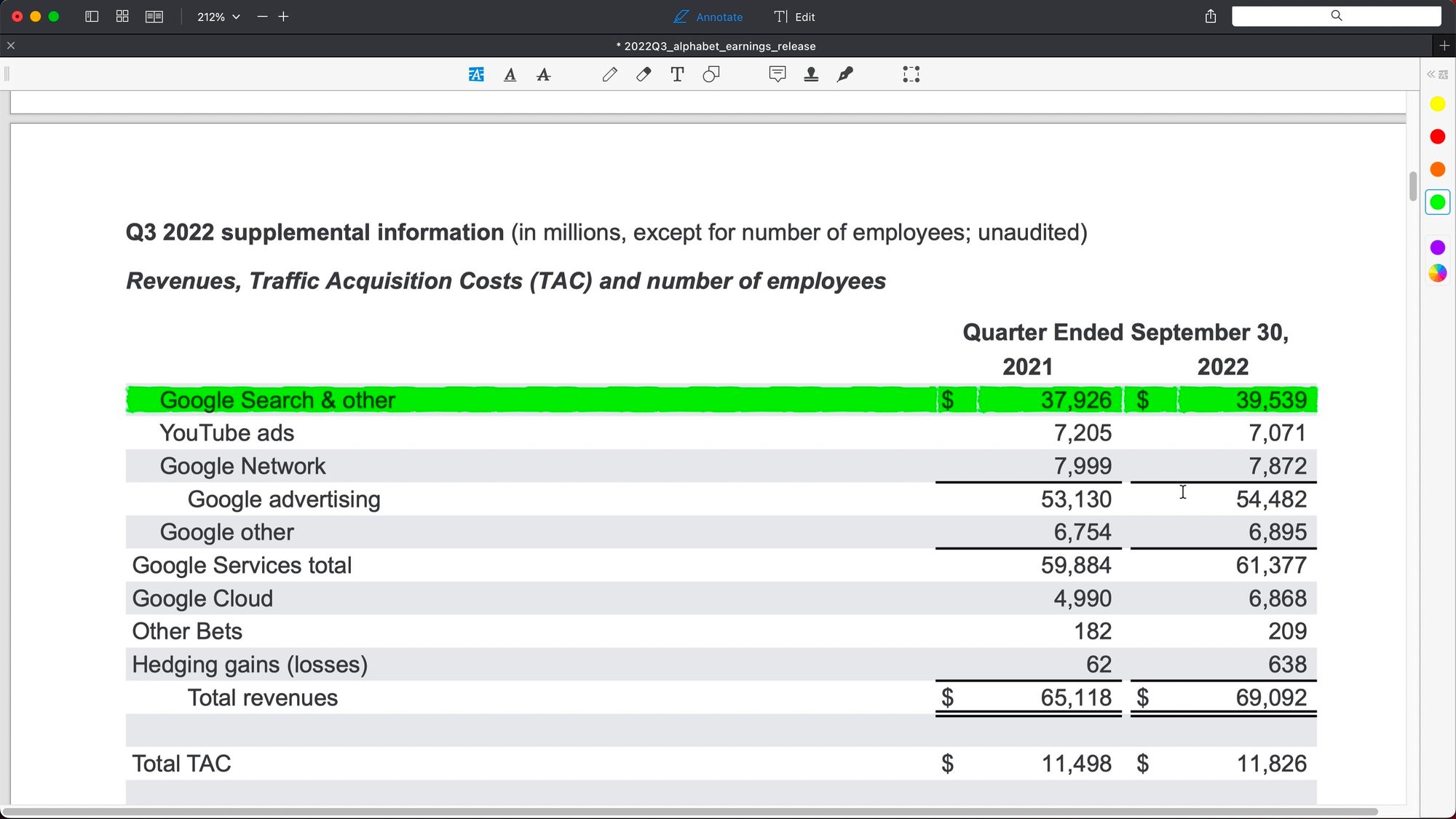 咱们看看 Google 在 2022 年第三季度的报告,实现了 690 多亿美元的收入,很不错了,但是,这其中有将近 400 亿美元来自于一个单一的源头,就是搜索广告。