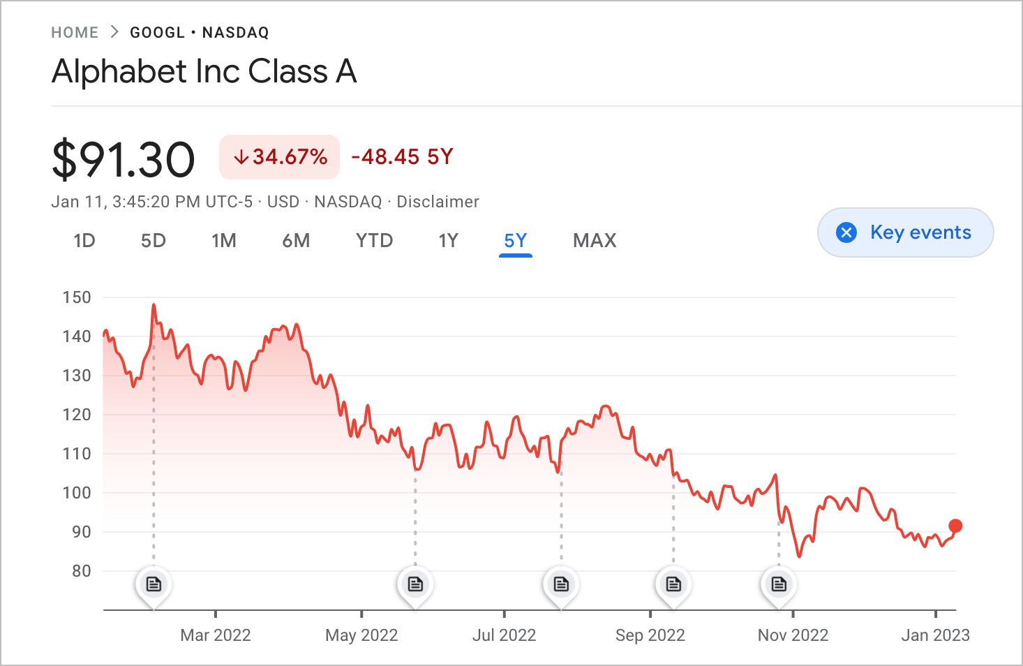 数据很牛吧?但是,Google 在 2021 年底的市值,接近 2 万亿美元,对比现在的 1.13 万亿,差不多腰斩。实际上,在 Google 的商业模式中,有一个很大的缺陷。