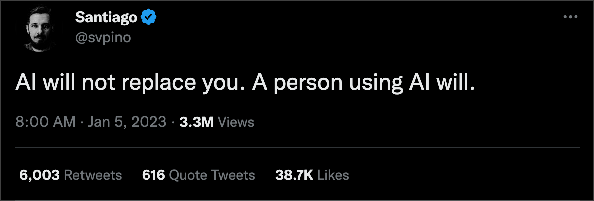 好,前面我们说过,当 ChatGPT 灭了 Google 之后,原先依赖于 Google 搜索吃饭的人怎么办?其实这跟以前经常出现的一个问题,就是 AI 如果夺取了你的工作怎么办是一样的问题。不管是因为 AI 直接夺取你的工作比如 AI 搬砖搬的又快又好还可以 007,还是因为 AI 消灭了一个行业导致你被牵连,解决方法就是马斯克的方法,打不过就加入。前几天刷推特时看到有人说的一句话我很赞同,将来夺取你工作的不是 AI,而是会 AI 的人。
