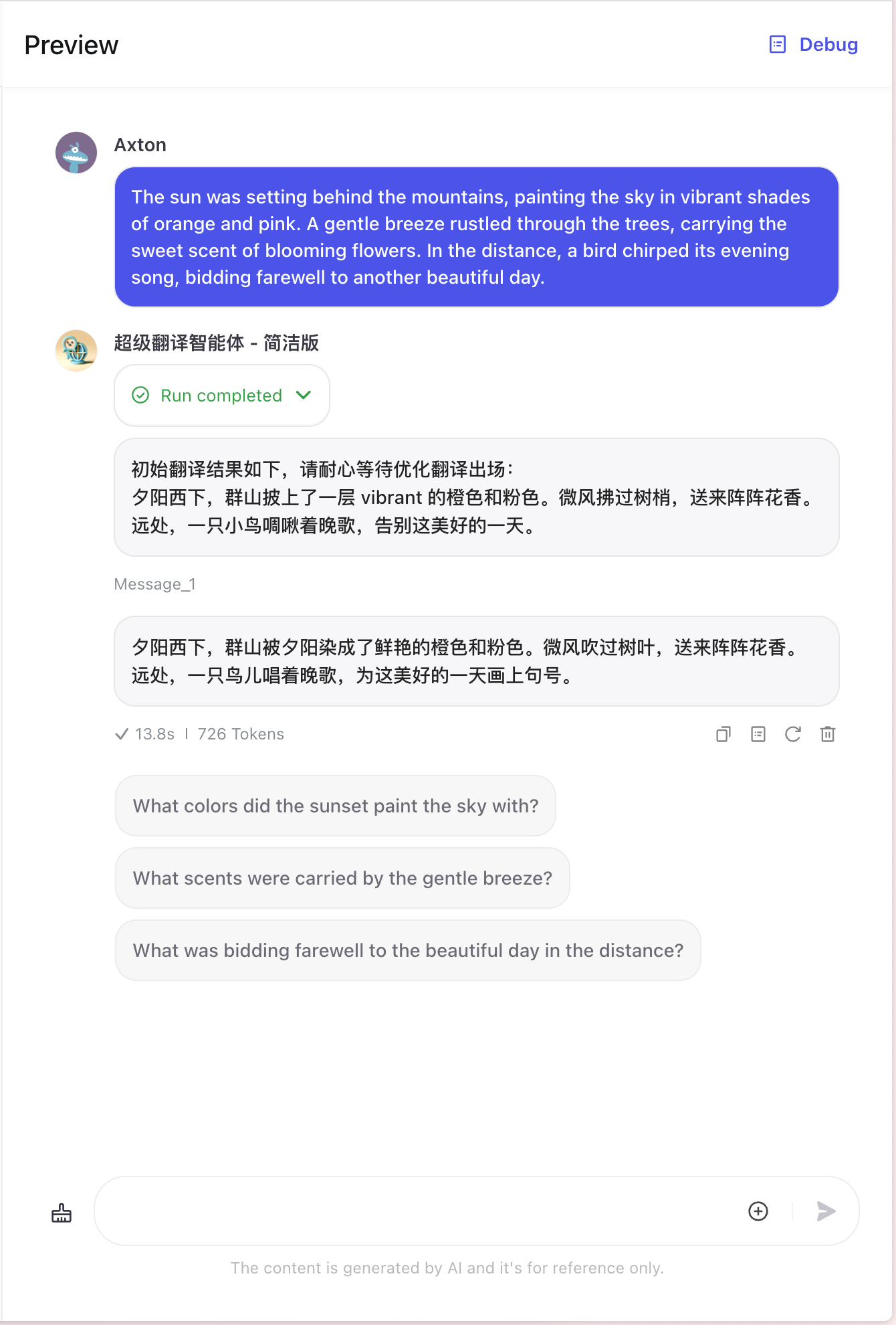 最后,把「优化翻译」最终生成的翻译内容作为输出,给到最后一个「结束」节点,整个工作流就完成了。我们点击「测试运行」来看一下效果。