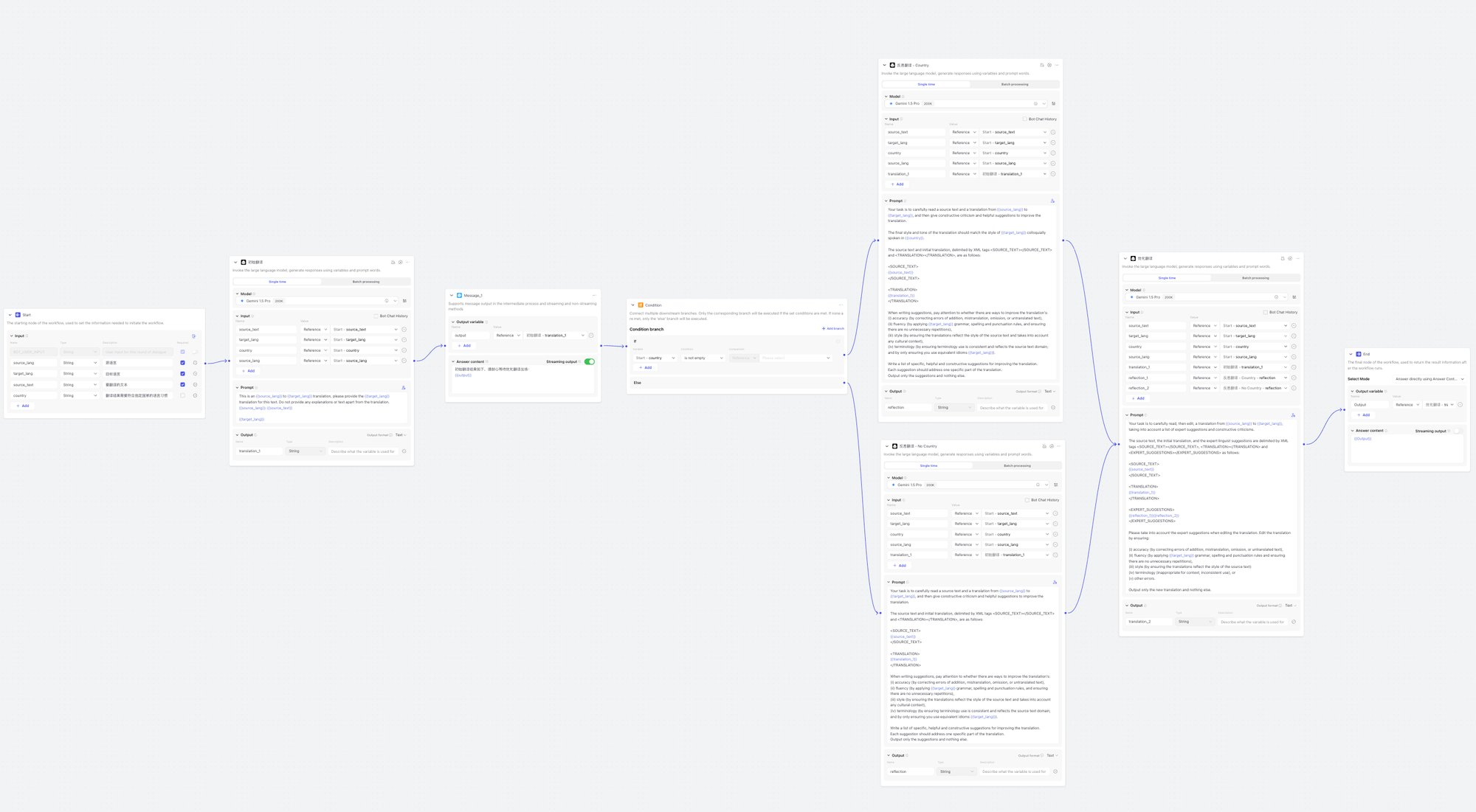 这里面的建议使用了两个变量,reflection_1 和 reflection_2,分别是前两个「反思翻译」节点的输出结果。一个是指定了国家和地区的反思翻译,另外一个是没有指定的。由于前两个节点会根据「条件节点」的结果不同而执行不同的节点,不会两个节点都执行,所以把他们两个的输出结果全部写在一起是没有问题的,在一次执行过程中,只会有一个输出结果有内容,所以不会产生冲突和重复。