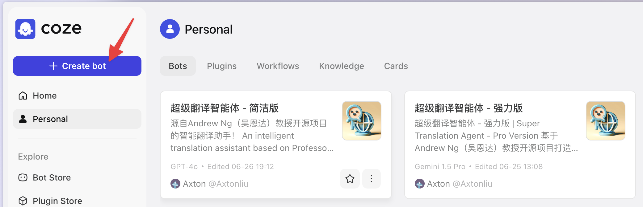 由于开源的项目是纯代码,用起来并不方便,因此我在 Coze 平台上完美复刻了吴恩达老师的反思翻译工作流。今天我将手把手教你如何在 Coze 平台上从零实现一个「反思型」AI 翻译的自动化工作流。跟着我一步步操作,你也能拥有一个强大的AI翻译助手!当然,你如果懒得动手,也可以直接在 Coze 的聊天机器人商店中搜索我的「超级翻译智能体」,一个是简洁版、一个是强力版,可以直接使用。这两个版本的区别就是,强力版可以对长文进行分块。