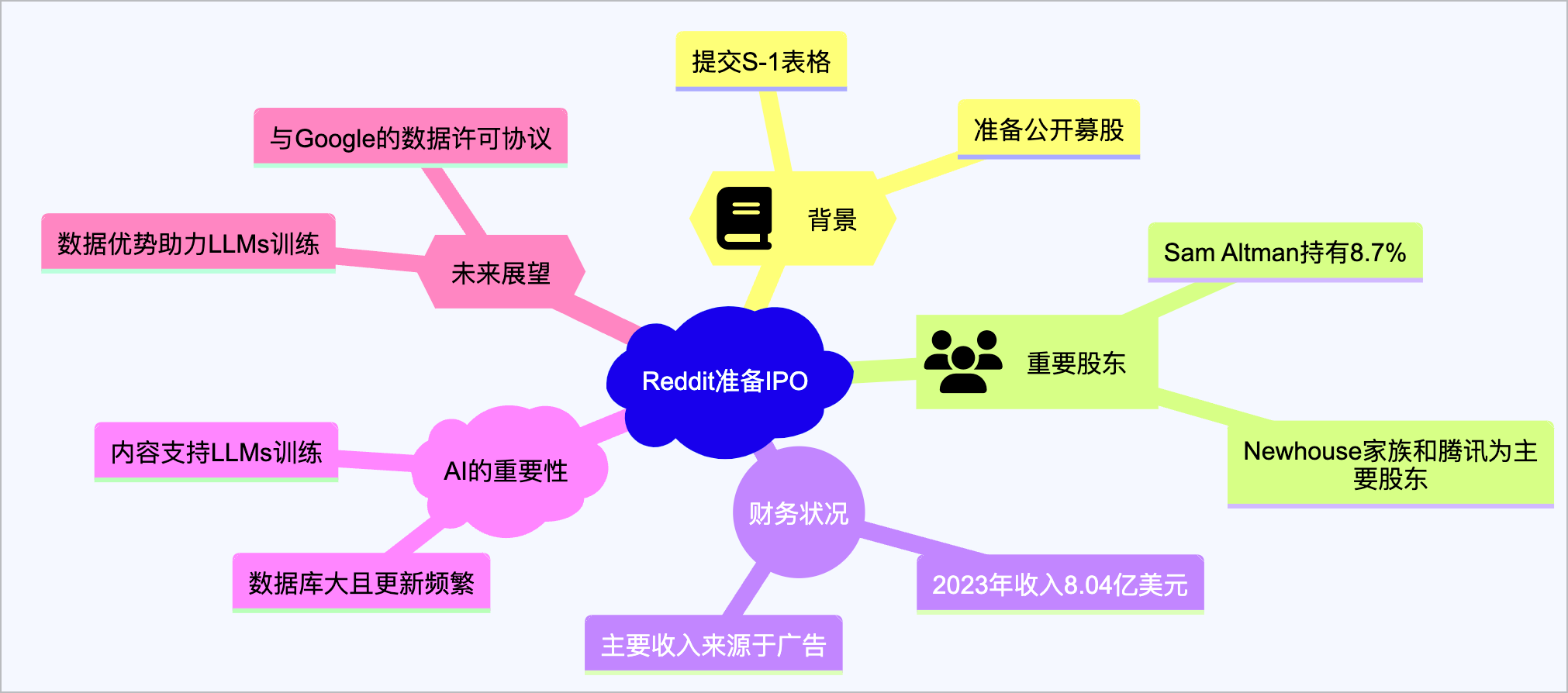 - 财务状况:2023年总收入为8.04亿美元,主要来自广告。尽管报告了9080万美元的净亏损,但Reddit强调人工智能作为潜在增长领域的重要性。