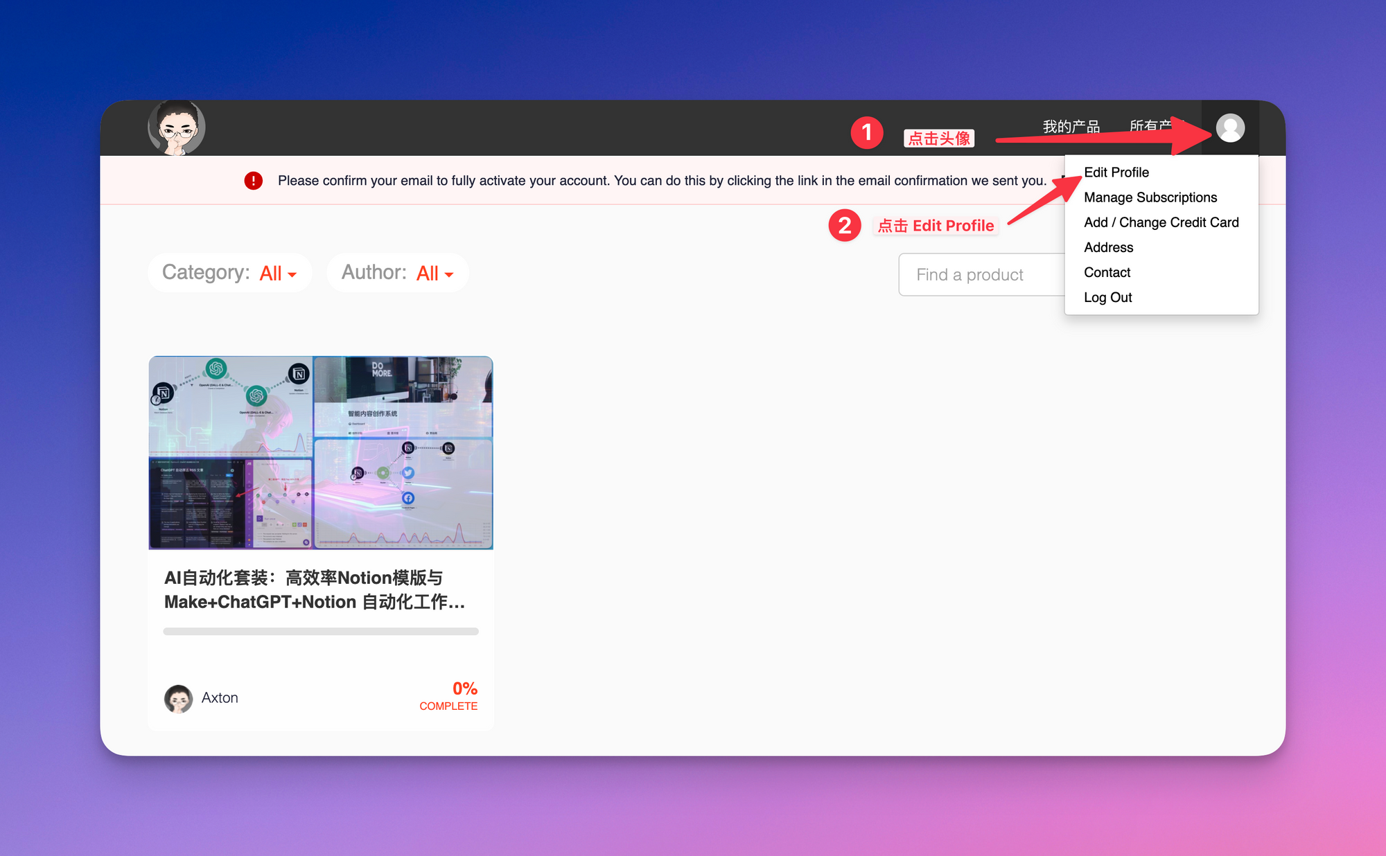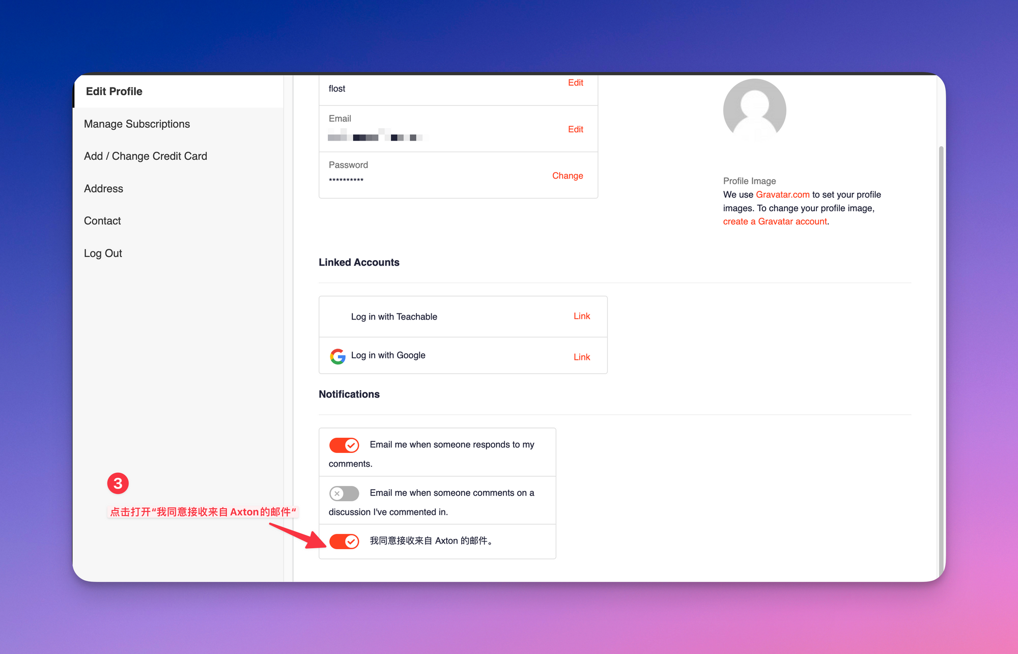 如果在注册时忘记了勾选“我同意接收来自Axton的邮件”,那么请登录到您的账户,点击头像,进入您的 Profile 中,打开“我同意接收来自Axton的邮件”的开关。