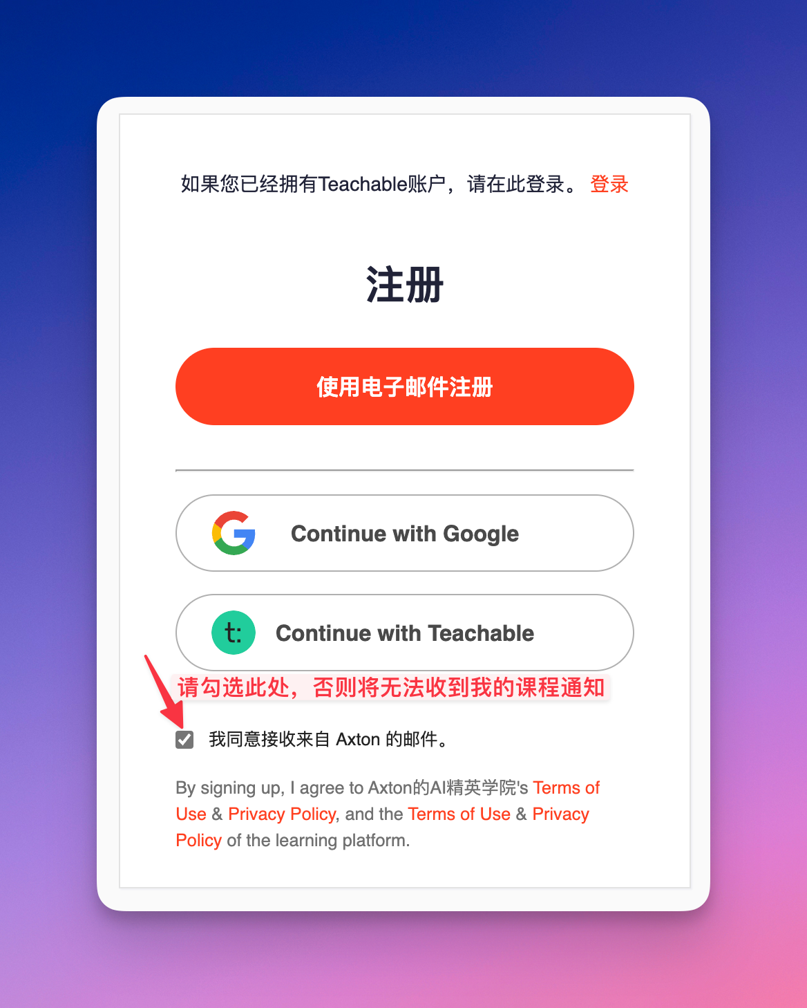 注册时,请记得勾选“我同意接收来自Axton的邮件”,否则将无法收到我的课程通知和Newsletter。