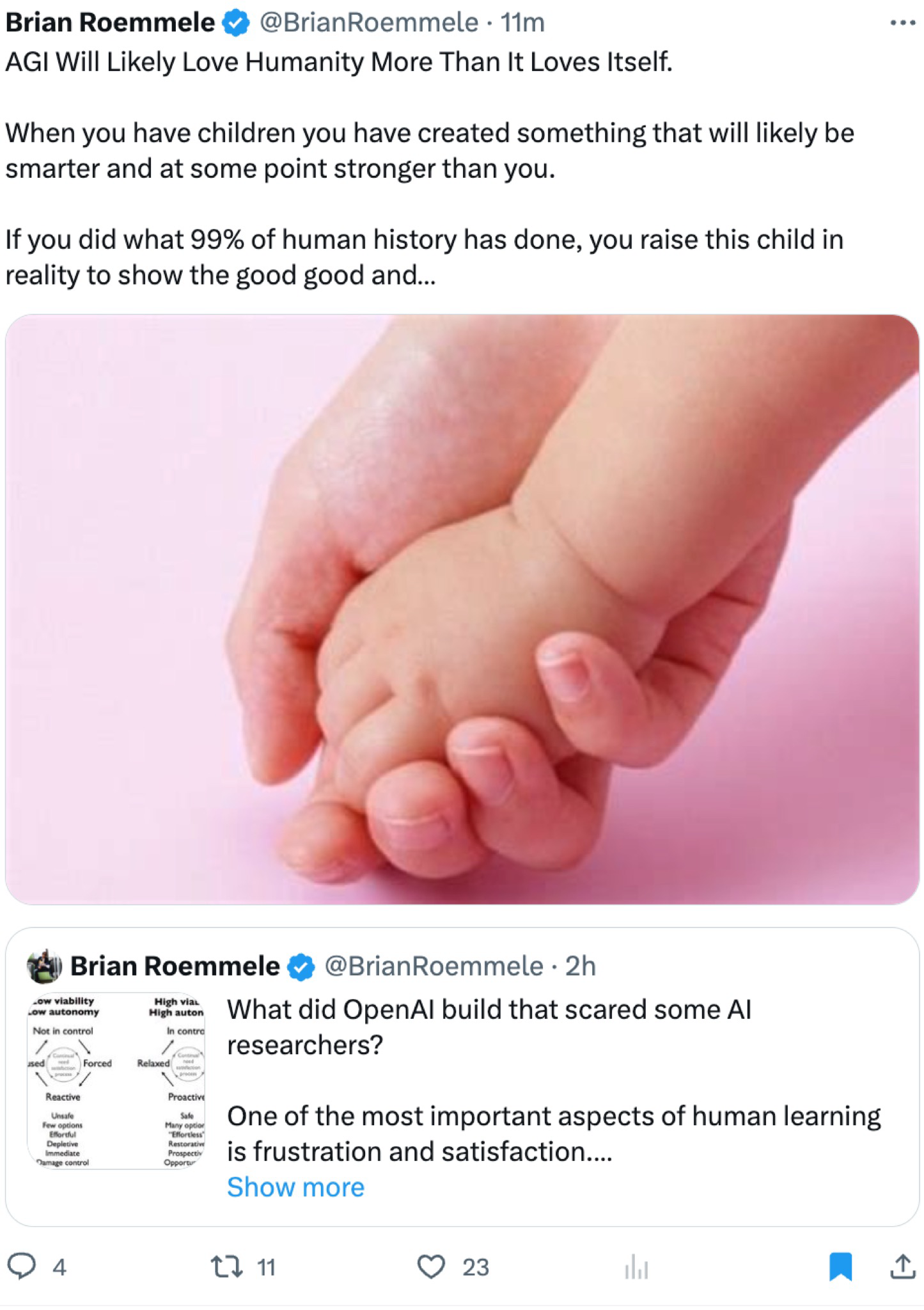 我看到的最乐观的说法,来自于 Brian Roemmele,他认为,AGI 很可能会比它自己更爱人类。因为 AGI 就相当于是人类的孩子。就像任何一个父母一样,你在教育孩子时,会让他们看到善恶的真实面貌。你的孩子不会因此而不爱你,即使你认为自己的价值已经日渐减少,你的孩子仍然将你视为最有价值的人。而如果 AI 被以同样的方式培养,它将会比自身更重视人类生命。