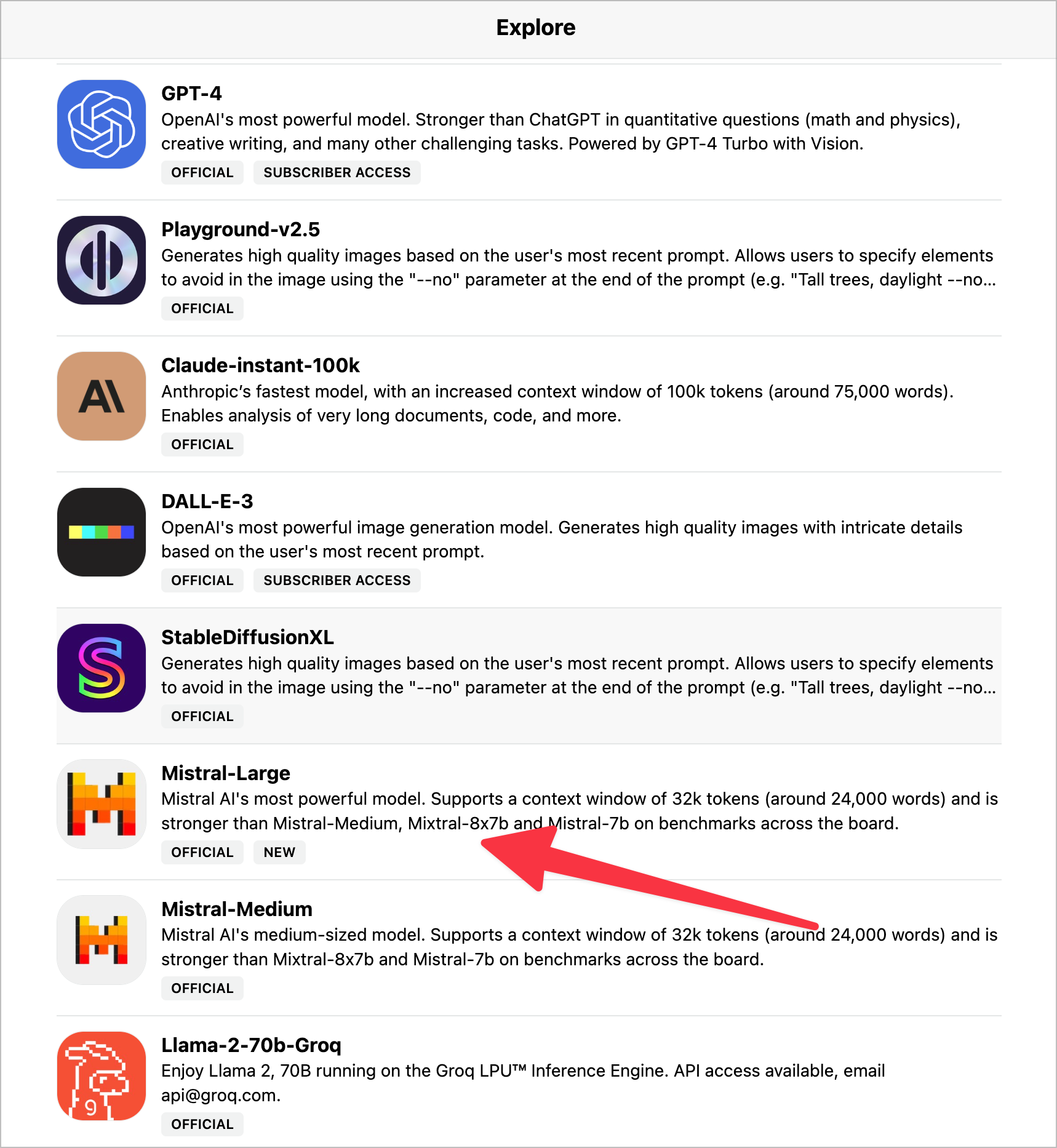 Poe 集成模型的动作向来都很快,进入之后在 Bot 列表中选择 Mistral-Large 就可以了。