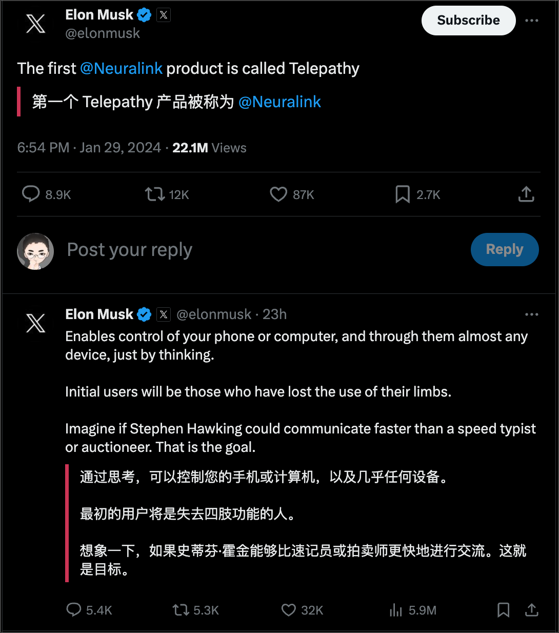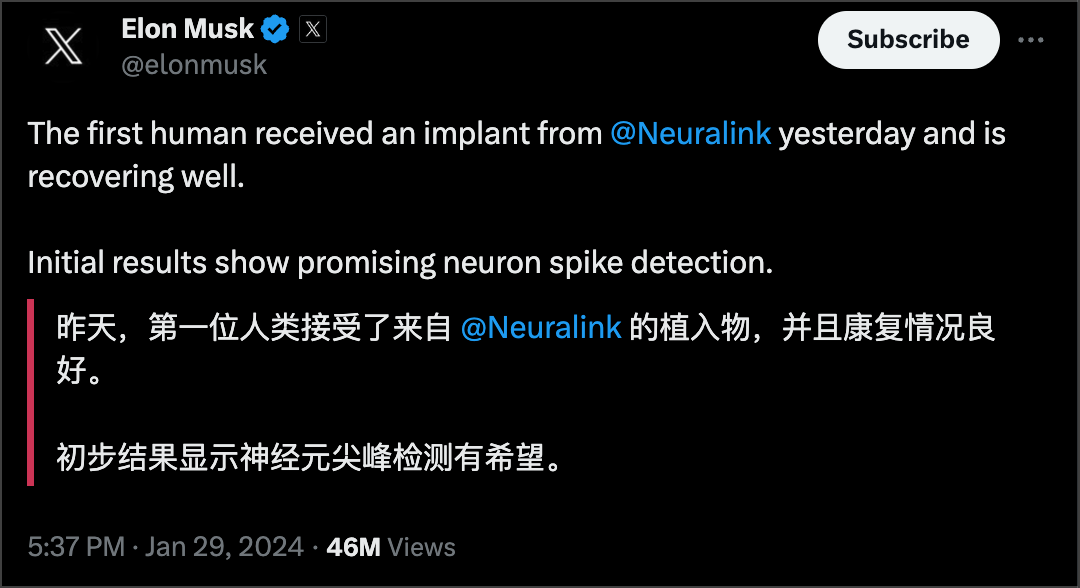 原文链接:Elon Musk Says a Human Patient Has Received Neuralink’s Brain Implant