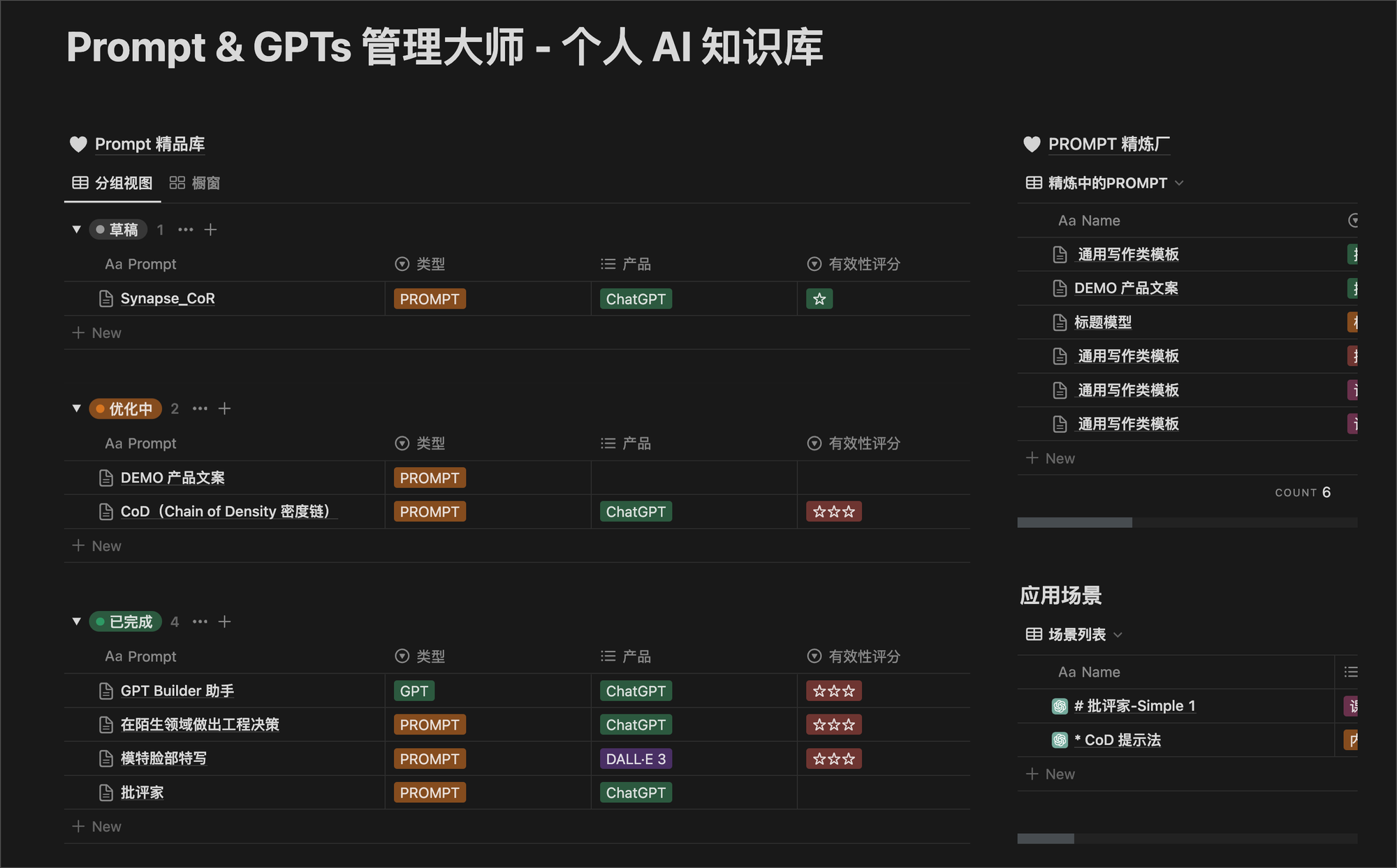 - PROMPT 以及 GPTs 的管理方式,关键是应用场景。应用场景的目的是记录 PROMPT 或者 GPTs 适合于什么样的任务或者项目,以及在完成任务过程中所有有价值的信息。