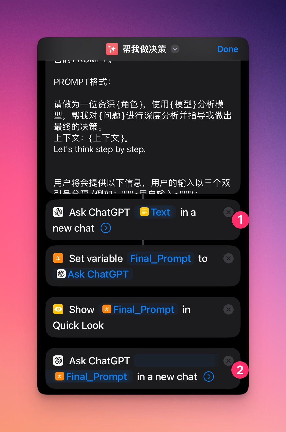 既然是捷径,我们就不能每次用的时候拷贝粘贴PROMPT,那显得太老土不够高级。因此我们首先就需要使用捷径,组装出我们的第一个PROMPT来,就是这样的的PROMPT:
