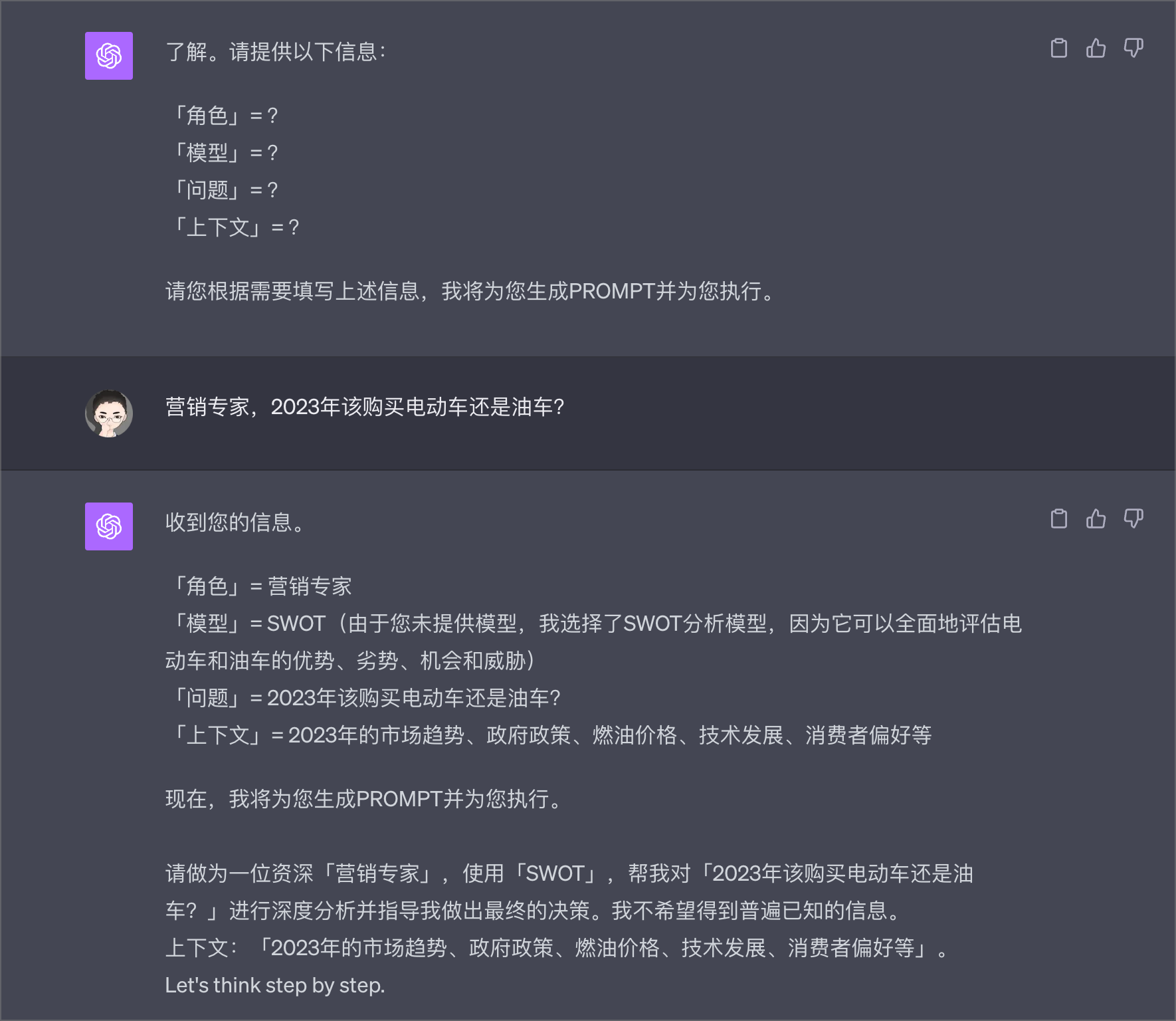 当用户提供了所需要分析的问题后,其实剩下的信息,角色、模型和上下文,也就是背景信息,用户可以提供,也都可以不用提供的。这时候,我们就问一下用户:你想提供更多信息吗?