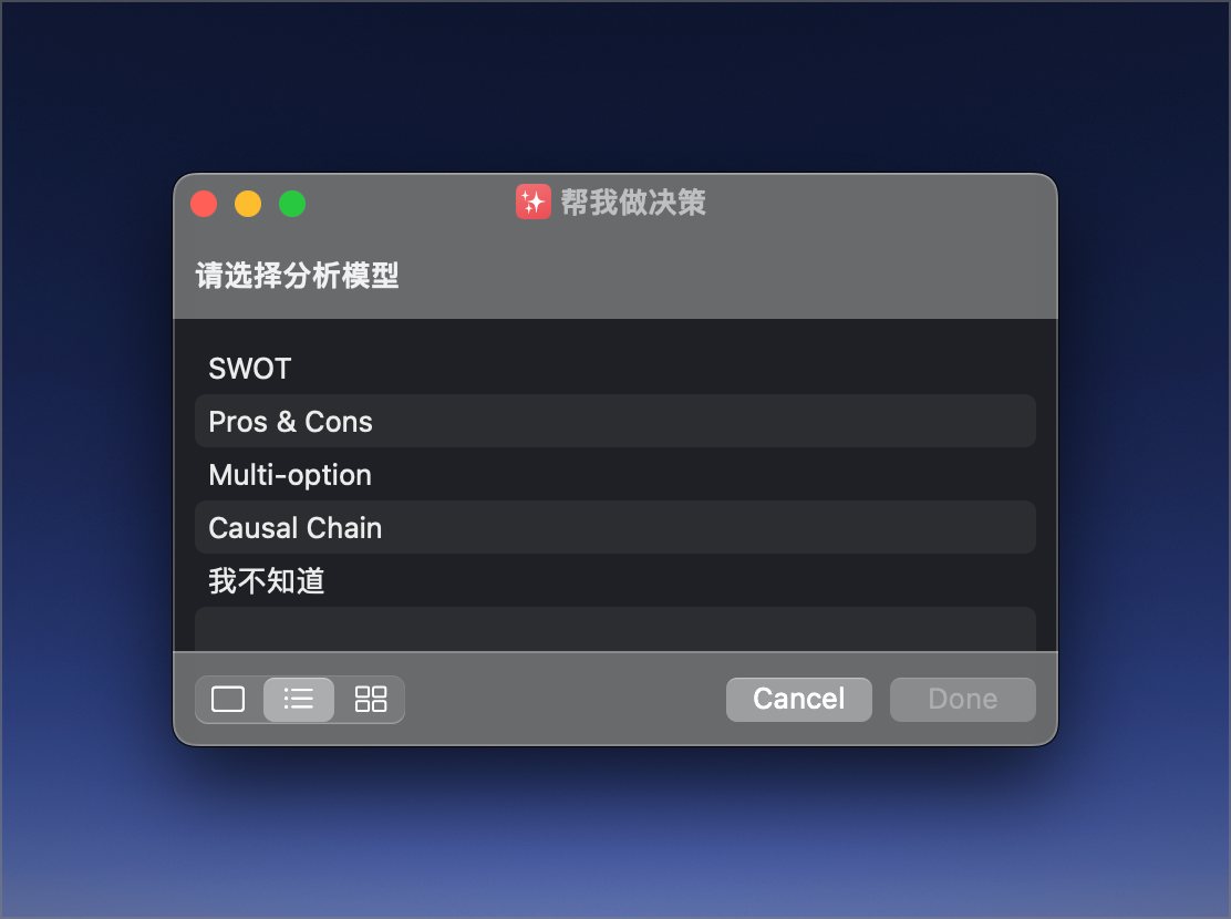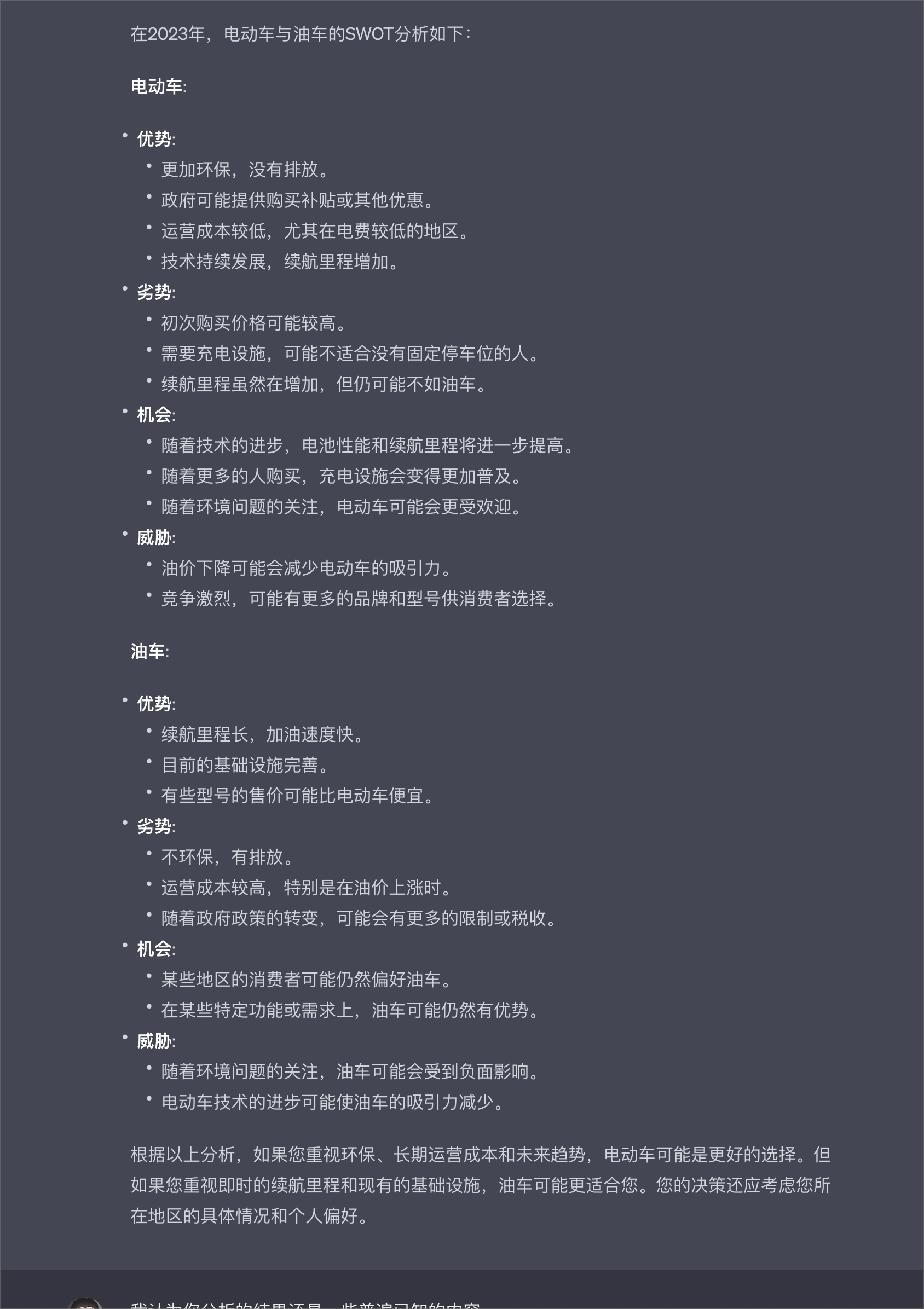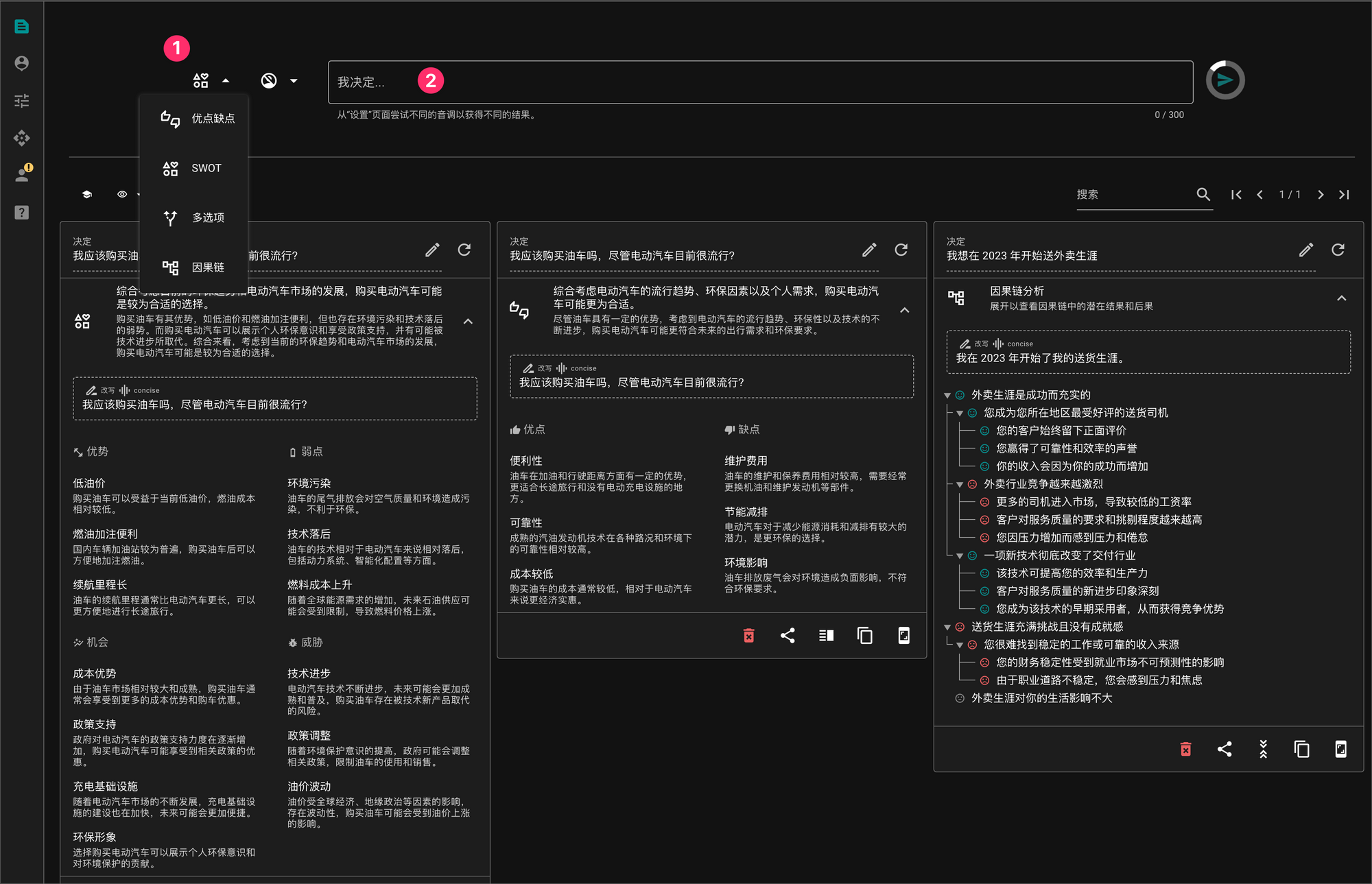 以上就是Rationale的界面,你可以在 1 处选择四种分析模型中的一种,然后在 2 处输入你需要进行分析的问题,比如我测试的例子就是选择了两种分析模型,一种是优点缺点,一种是SWOT,来分析 “我应该购买油车吗,尽管电动汽车目前很流行?”这个问题。