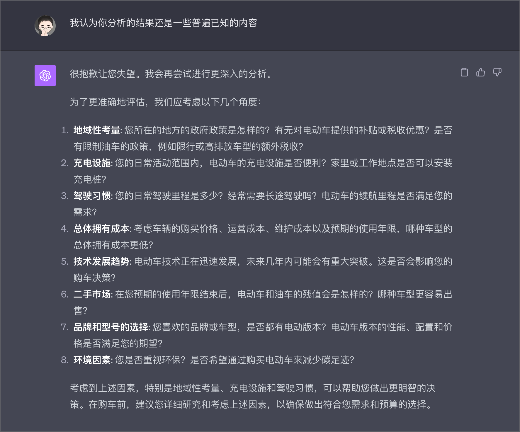 虽然我让ChatGPT不要给我普遍已知的信息,但是实际上差不多还是普遍已知的信息,于是我就说了他一句“我认为你分析的结果还是一些普遍已知的内容”,ChatGPT就赶紧认错,然后给我提出了一堆更深入的问题。
