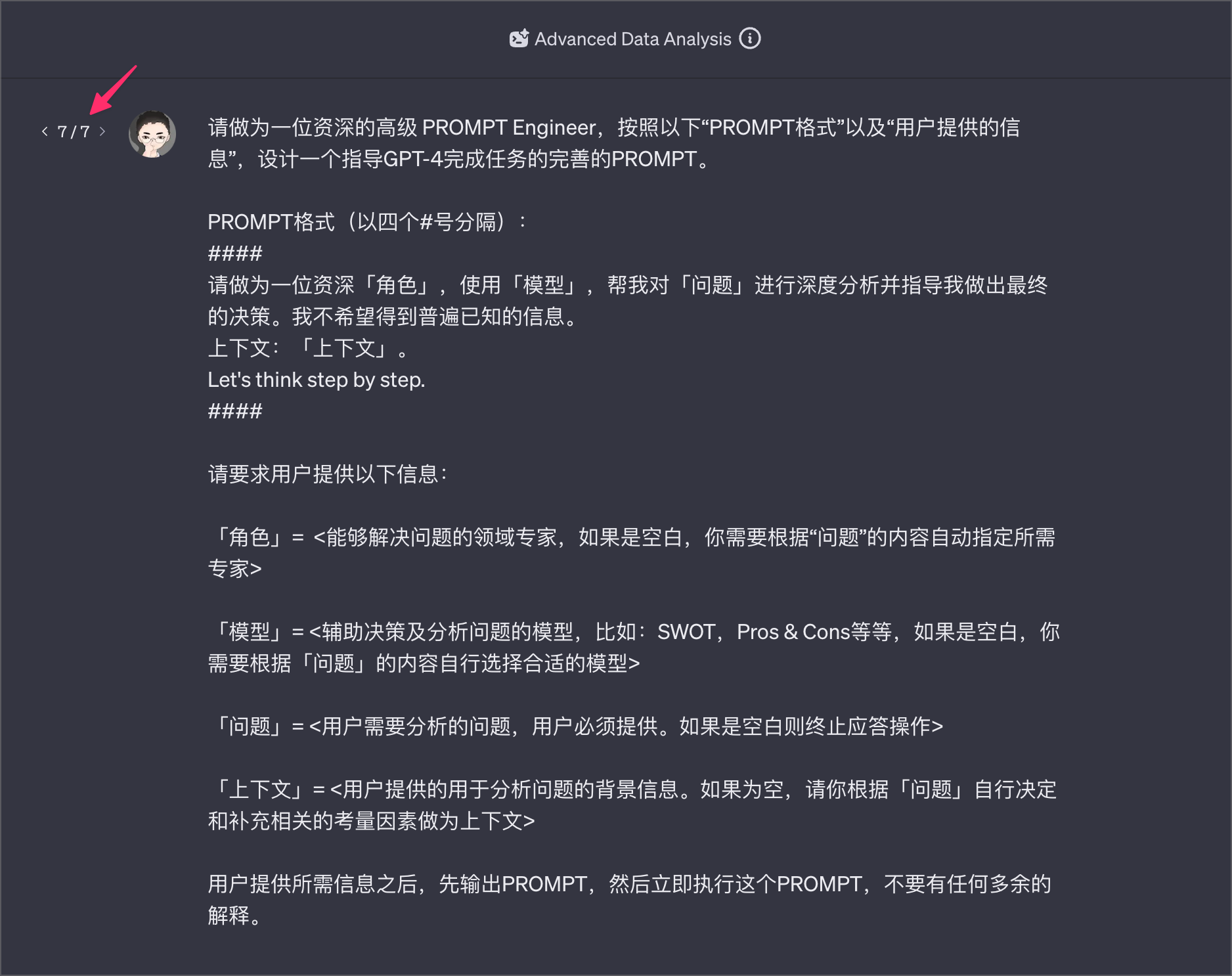 好,这是我设计好的Prompt,大家看到这里的7,说明已经改过第7版了,不过相比捷径部分呢,ChatGPT这里还算简单些。